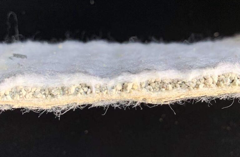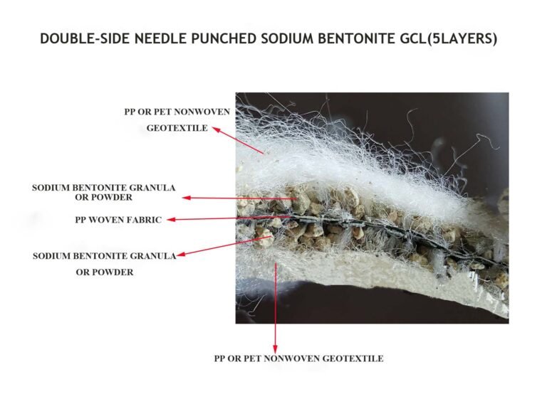There are five layers from the top: nonwoven geotextile, sodium bentonite granular, PP woven fabric, sodium bentonite granular, and nonwoven geotextile. Both of the materials are needle punched together, and both sides of PP woven fabric are filled with bentonite granular. During the production process of 3 layers of GCL, when the upper surface of nonwoven geotextile is wrinkled, the quantity of bentonite granular will be reduced between woven and nonwoven geotextile. But for the double sides needle punched, when there is a winkled area, the lower layer will be filled with more bentonite granular, thus making up for the reduction of bentonite granular lose.